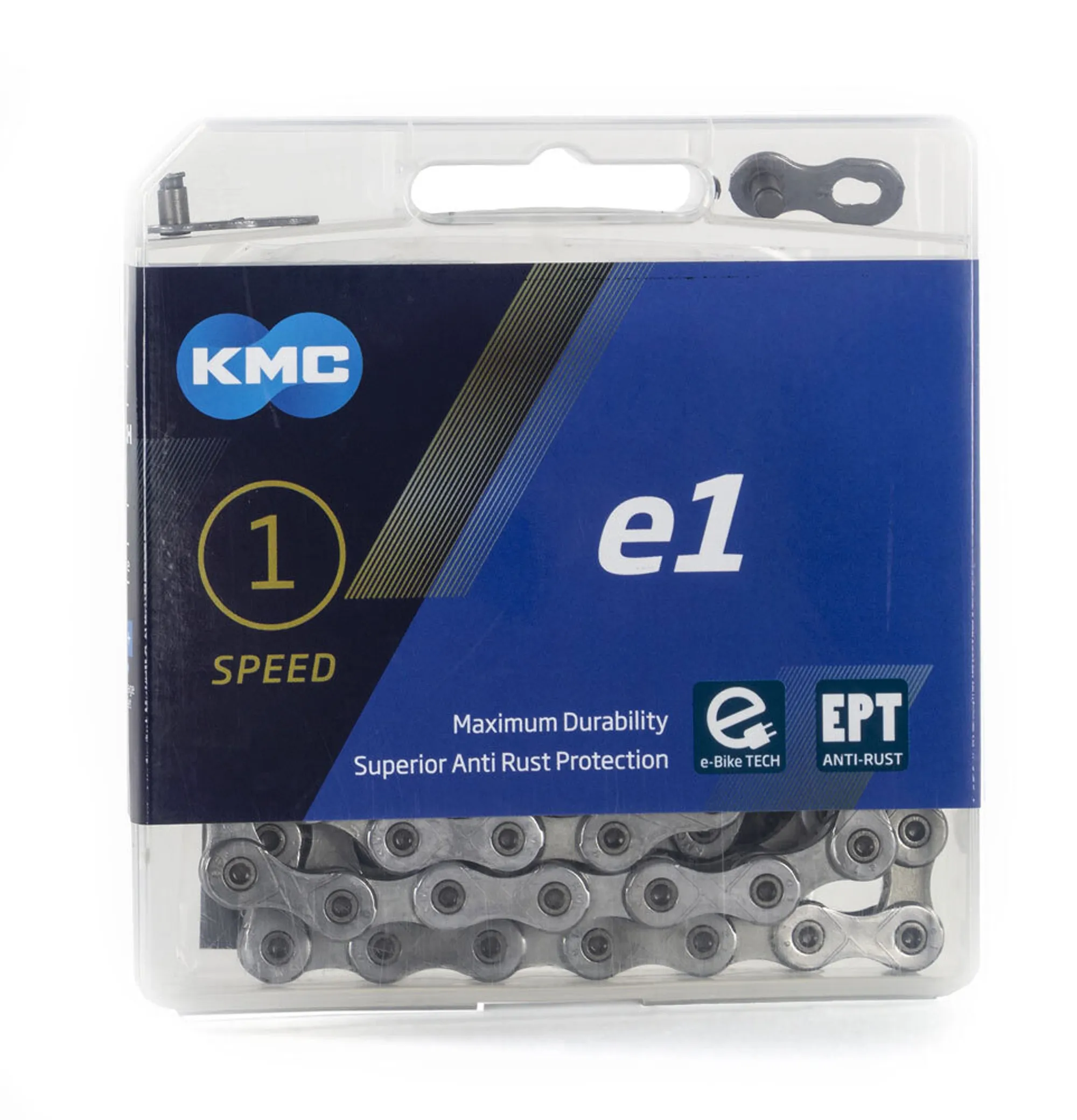 De KMC e1 EPT ketting is geoptimaliseerd voor e-bikes met naafversnelling/single speed die zijn voorzien van een middenmotor. De EPT-coating biedt maximale roestbescherming en de ketting garandeert een hoge duurzaamheid met een te verwachten kilometrage van meer dan 3500km.