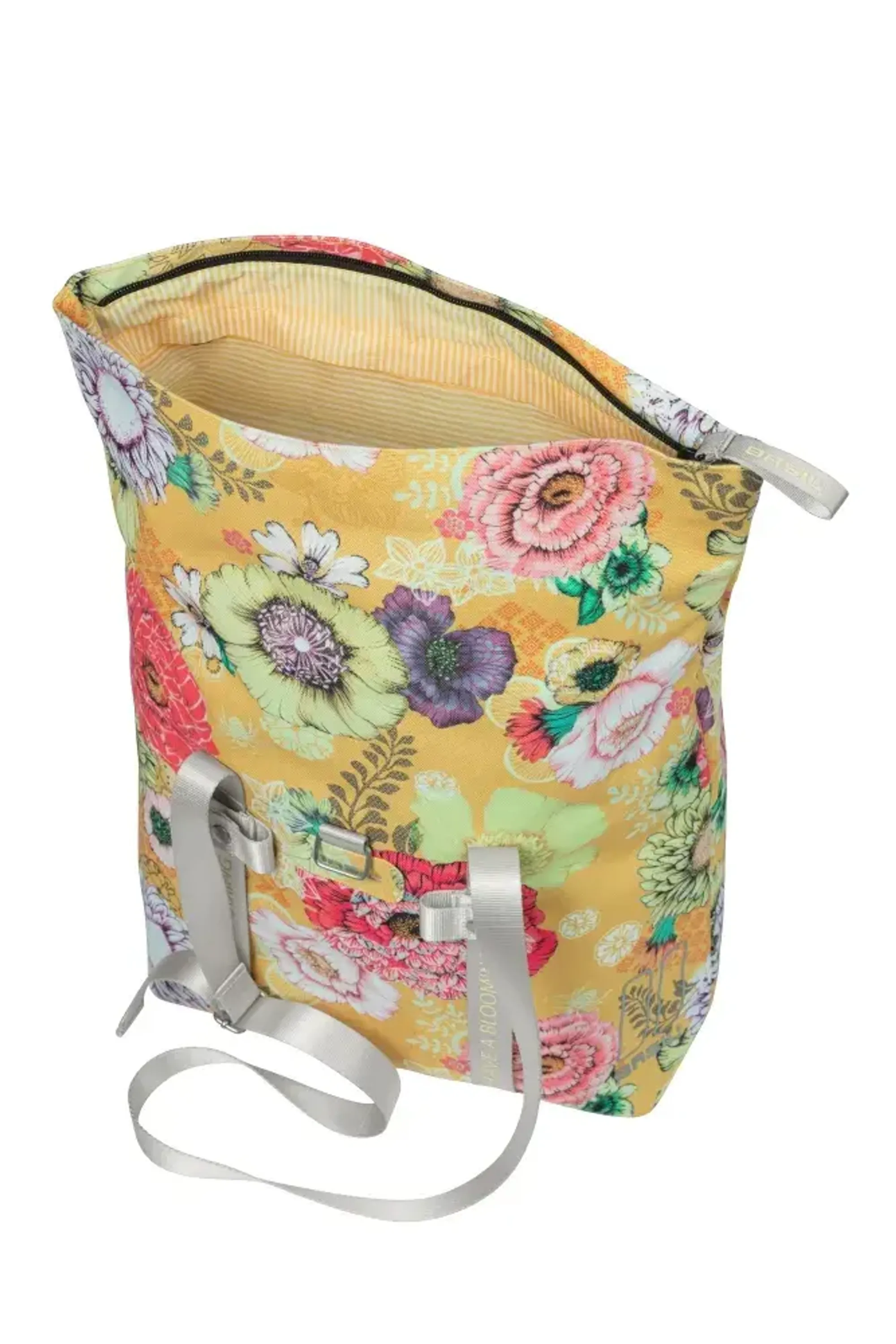 De Basil Bloom Field is een vrolijke en duurzame fietsshopper die dankzij het gele design met handgeschilderde bloemenprint direct in het oog springt. Gemaakt van gerecycled PET-plastic combineert deze tas stijl met milieubewustzijn. Met een inhoud van 15 tot 20 liter biedt de shopper voldoende ruimte voor dagelijkse boodschappen, werkspullen of een picknicklunch. Binnenin vind je een gepolsterd laptopvak en een ritsvak voor kleinere items, terwijl de stevige bodemdoppen zorgen dat de tas stabiel blijft staan.