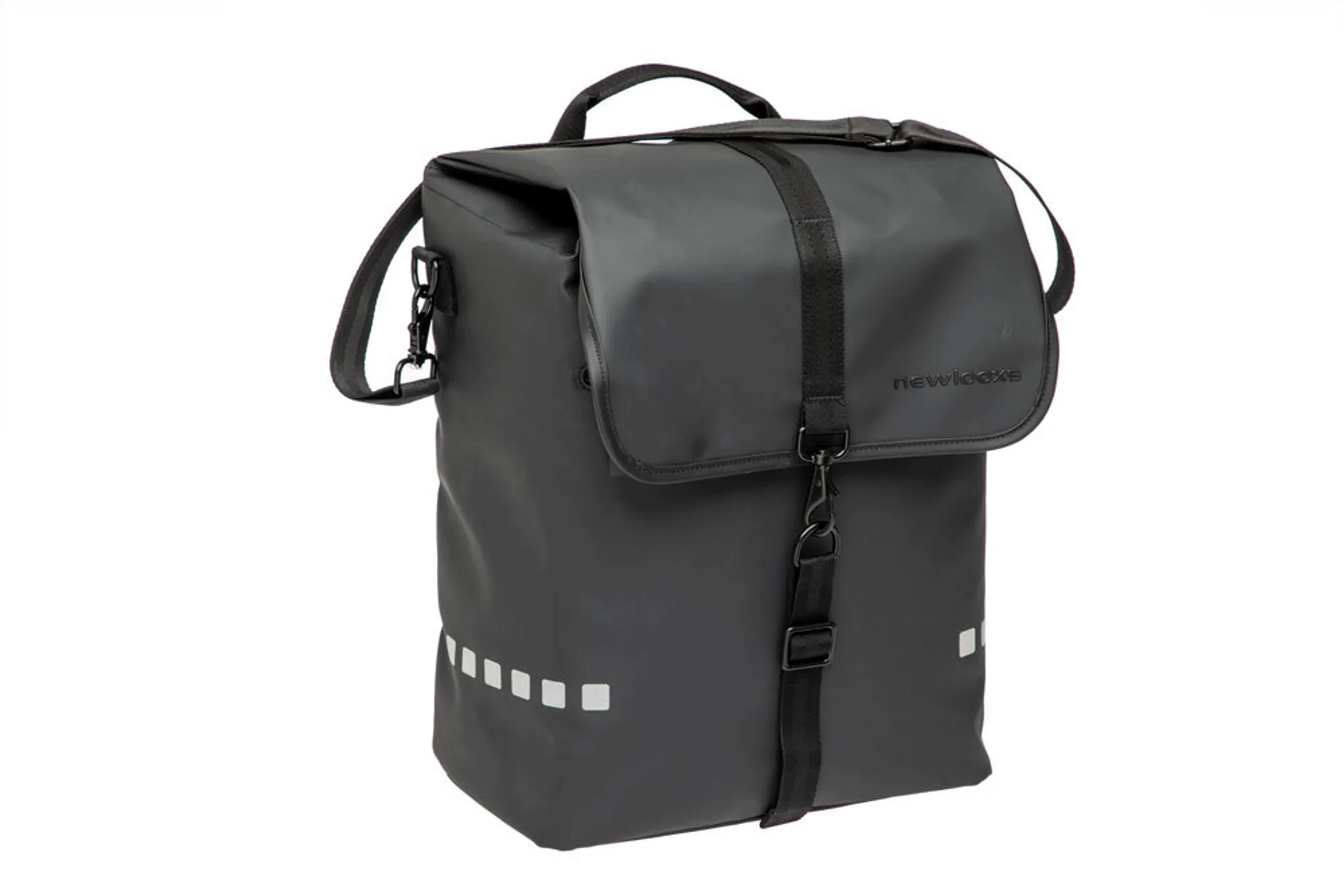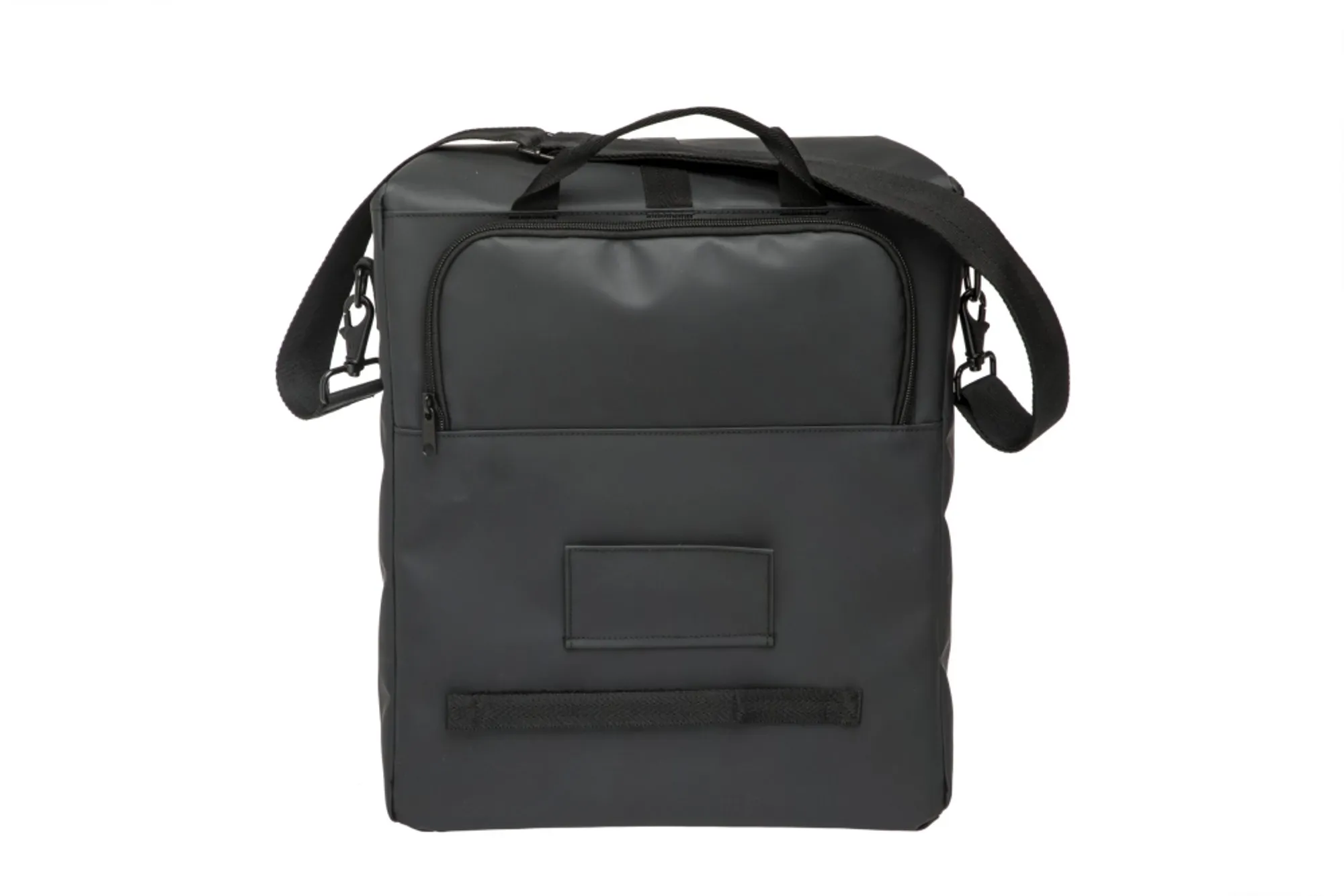 De tas is eenvoudig aan de bagagedrager te bevestigen met een handige haaksluiting. Eenmaal van de fiets af, klik je de schouderband eraan en neem je hem comfortabel mee. De bevestigingshaken werk je netjes weg achter een ritsflap, zodat de tas ook als gewone shopper of werktas dienst kan doen. Twee extra ritsvakken aan de buitenzijde geven je snel toegang tot kleine spullen zoals sleutels of je telefoon.