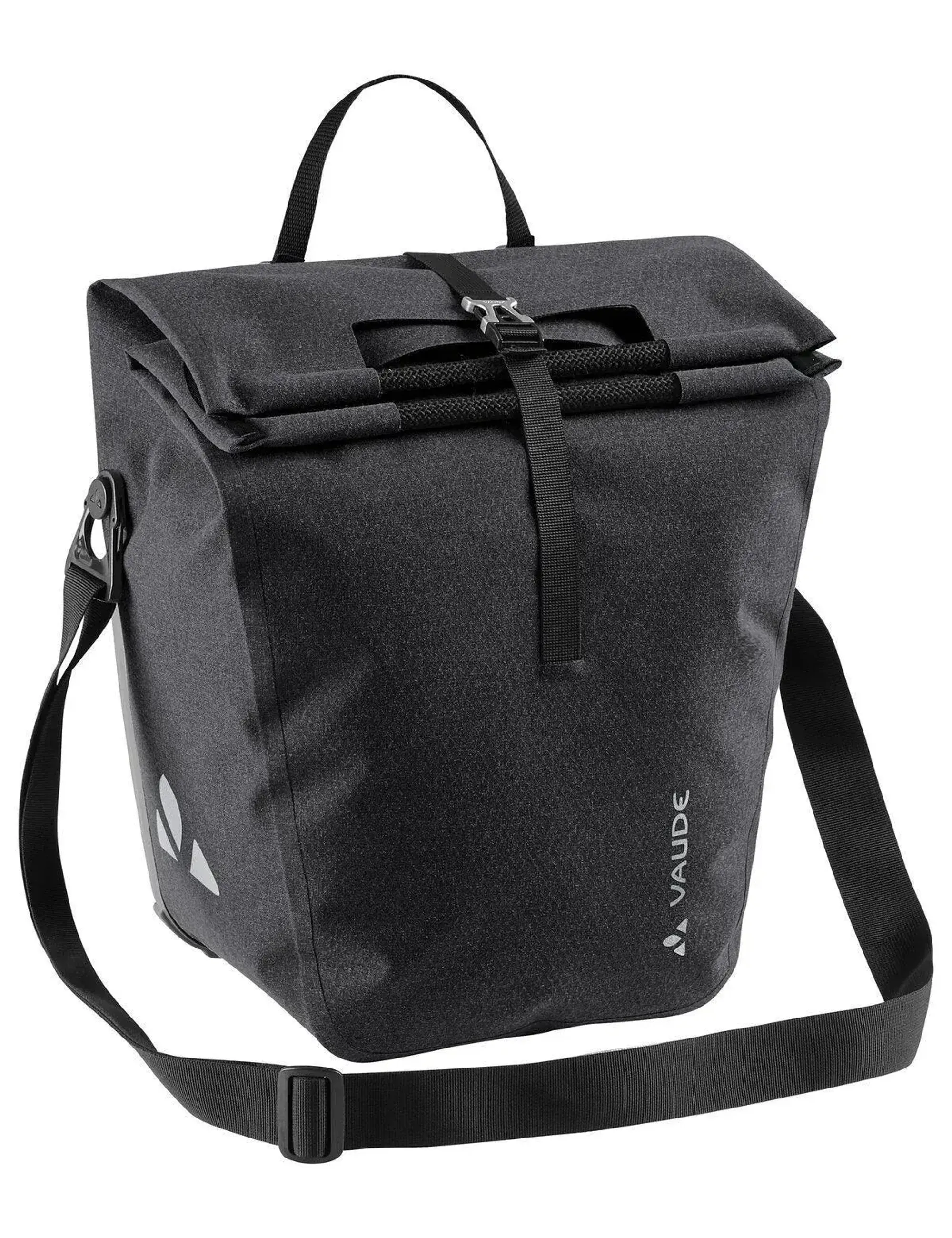 Het waterdichte en PVC-vrije textiel is gelast in plaats van genaaid, wat zorgt voor een schone afwerking en volledige bescherming tegen regen. De ruime opening aan de bovenzijde maakt in- en uitladen eenvoudig, terwijl het stevige materiaal de inhoud goed op zijn plaats houdt, ook als je onderweg flink beweegt. Dankzij de stevige handgrepen neem je de tas makkelijk mee van de fiets af, en met de afneembare schouderband draag je hem comfortabel verder.