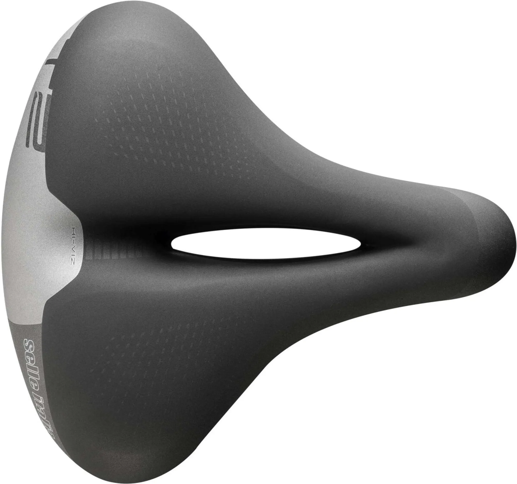Bij het T2 Flow zadel draait alles om comfort. Dankzij de brede en ergonomische zitting is het mogelijk om comfortabel te fietsen, omdat de zitbeenderen overal worden ondersteund. De gellaag in de vulling, samen met de centrale Flow uitsparing die de druk van het perineum wegneemt, helpt het comfort in elke situatie te verbeteren. De Hi-Viz inzetstukken op de achterkant van het zadel zorgen voor zichtbaarheid en veiligheid, zelfs 's nachts.